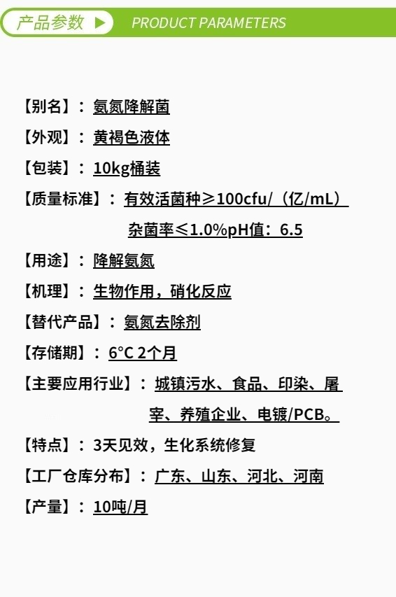 本品是經(jīng)過篩選培養(yǎng)的超強硝化細菌,具有更強生物活性及耐毒性,同時產(chǎn)品添加營養(yǎng)元素,可以顯著提高細菌的生長繁殖速度,更好抵抗負荷沖擊,穩(wěn)定污水系統(tǒng)的硝化效率。