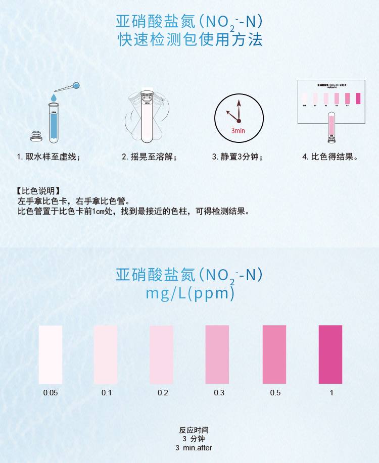 2.本產品檢測水中亞硝酸鹽氮(NO2- -N)含量在0.05-1mg/L(ppm)范圍內,若要檢測0.5mg/L以上濃度水樣,請預先稀釋水樣后再進行測定,具體操作見稀釋說明書。
