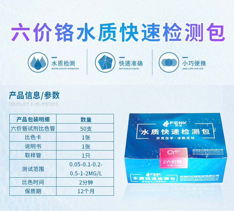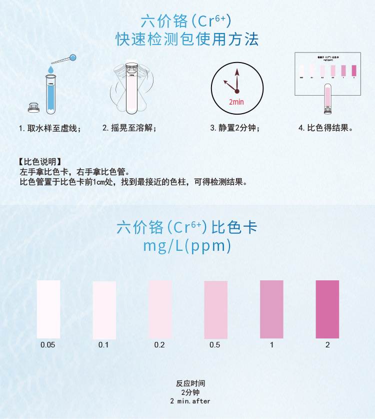 2.本產(chǎn)品檢測水中六價鉻(Cr)含量在0.05-2mg/L(ppm)范圍內(nèi),若要檢測2mg/L以上濃度水樣,請預先稀釋水樣后再進行測定,具體操作見稀釋說明書。