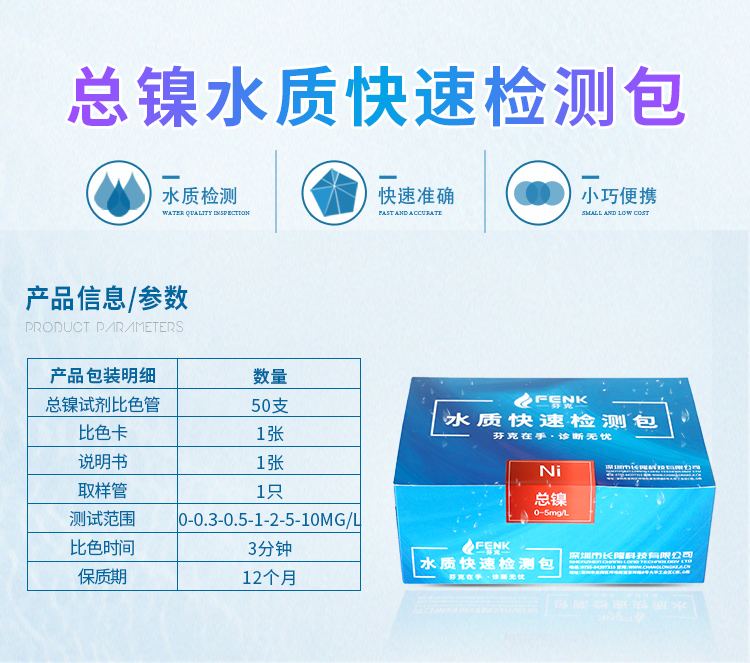 3.水體中鎳主要以較穩定的二價鎳形式存在,故本產品以測定二價鎳來判斷水中總鎳含量。