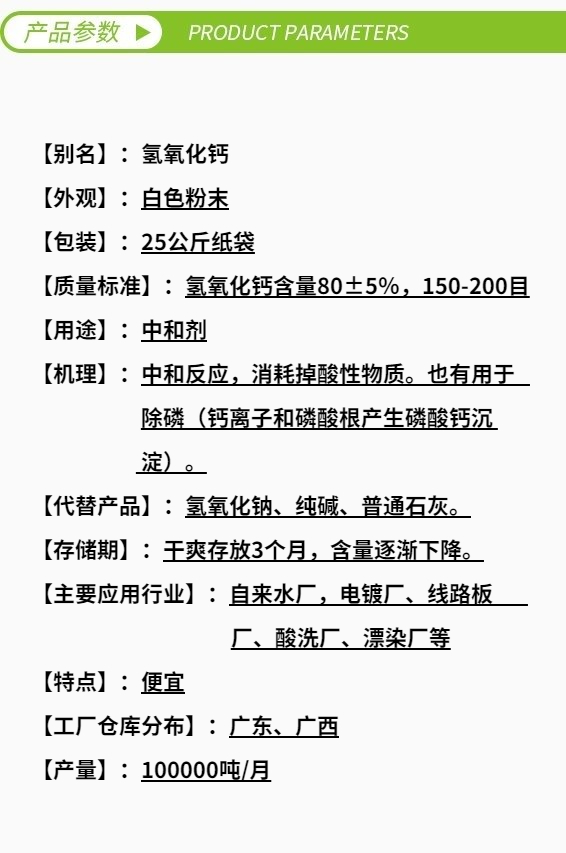 1.調節酸性污水的pH值,廣泛用于電鍍、化工、線路板、酸洗、印染、造紙等行業的污水處理;